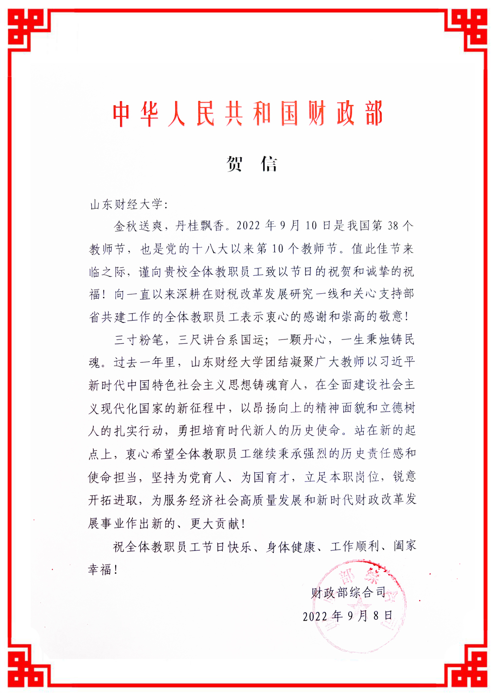 9月8日,在第38个教师节到来之际,财政部向我校发来教师节贺信,向学校全体教职员工致以节日的祝贺和诚挚的祝福!向一直以来深耕在财税改革发展研究一线和关心支持部省共建工作的全体教职员工表示衷心的感谢和崇高的敬意!祝愿全体教职员工节日快乐、身体健康、工作顺利、阖家幸福!