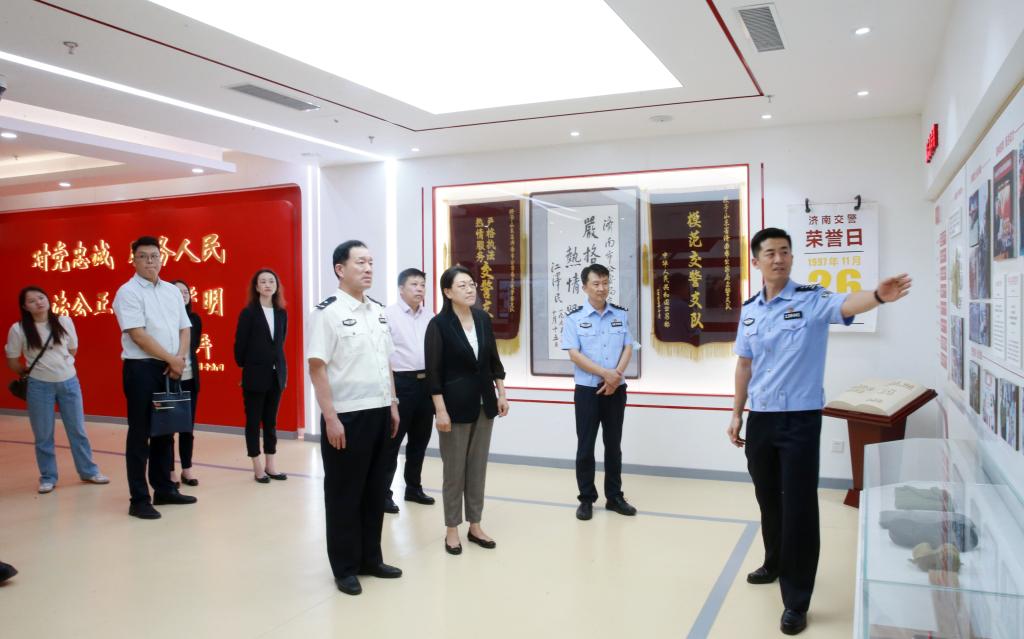 张红霞一行在李超陪同下参观了“强警之路”展示馆,详细了解了济南交警的发展历程、工作理念和警营文化,对济南交警严格执法、热情为民的形象予以高度赞扬,对全警风雨无阻、尽心尽力守护城市道路交通畅通致以崇高敬意。