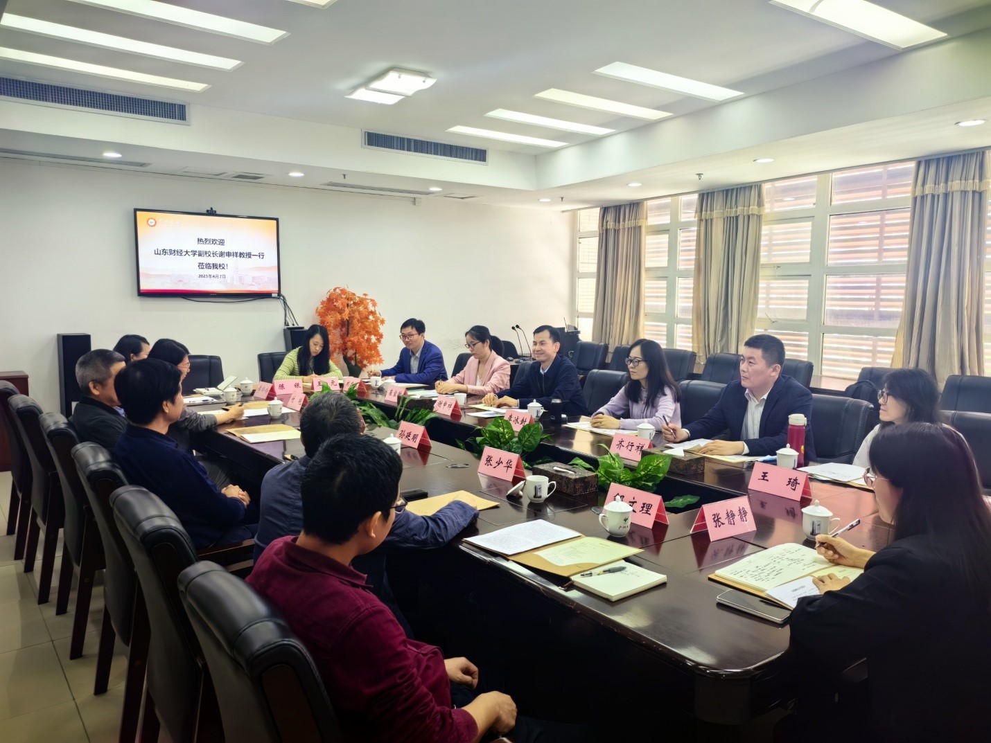 4月6日,在广东外语外贸大学经济贸易学院,院长孙楚仁介绍了该校的基本情况,重点就数字经济专业的建设过程和发展状况进行了说明。谢申祥从学科建设、人才培养、科学研究等方面介绍了我校情况,高度赞扬广东外语外贸大学近年来在数字经济、科研工作、学生就业等方面取得的成绩,希望双方在数字经济专业和学科建设方面加强沟通协作、优势互补,共同发展。