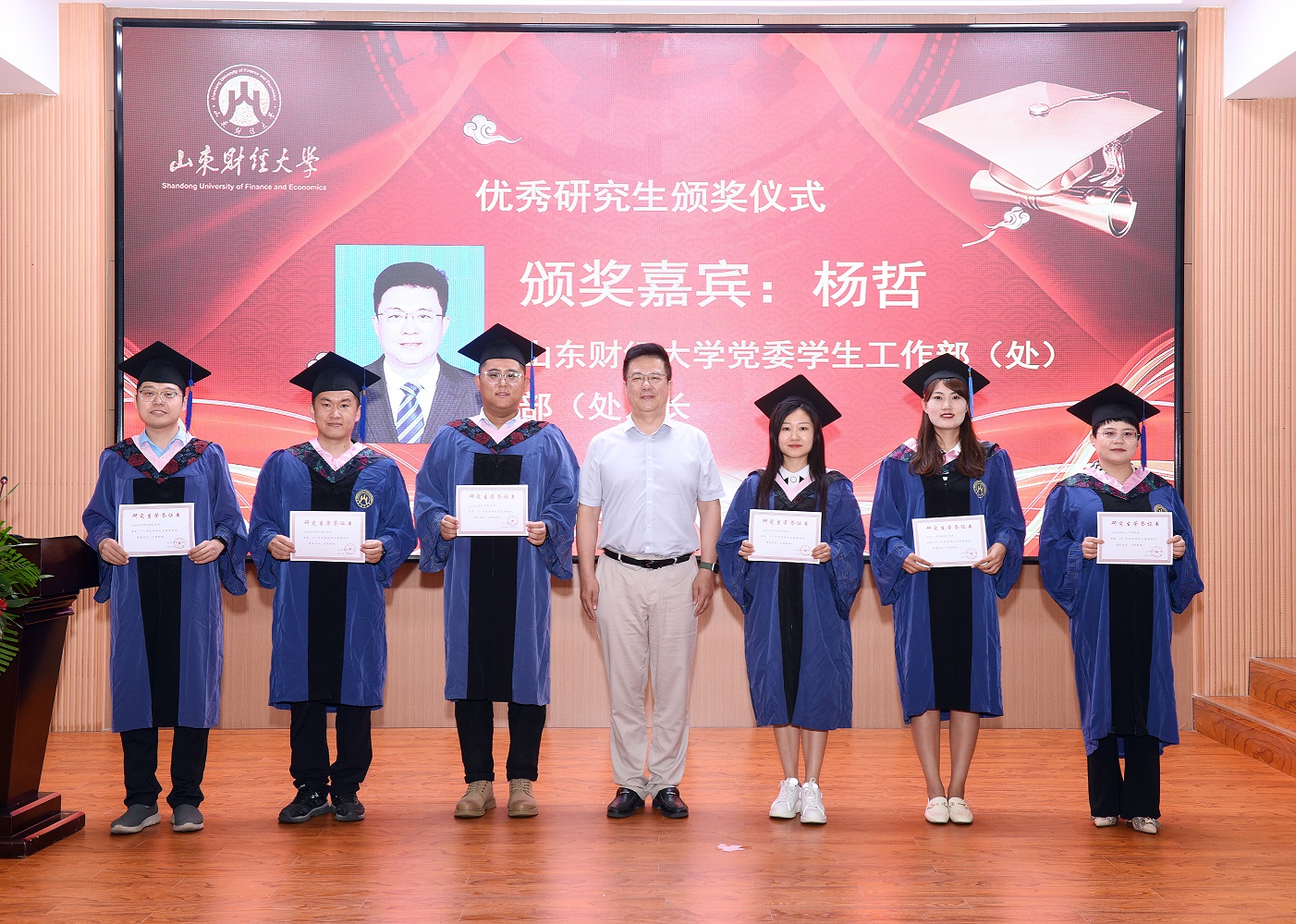 党委学生工作部部长杨哲为优秀研究生代表、优秀研究生干部代表、优秀毕业生代表颁奖。