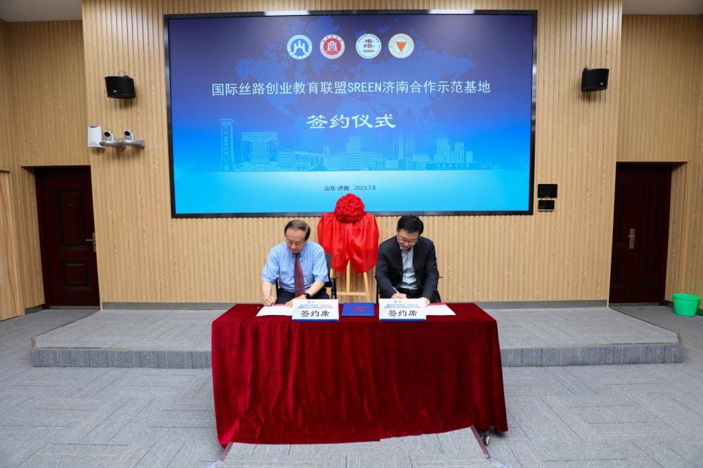仪式上,陶虎与王重鸣共同为国际丝路创业教育联盟济南基地揭牌。黄河商学院院长刘毅鹏与王重鸣签署了国际丝路创业教育联盟济南基地协议。