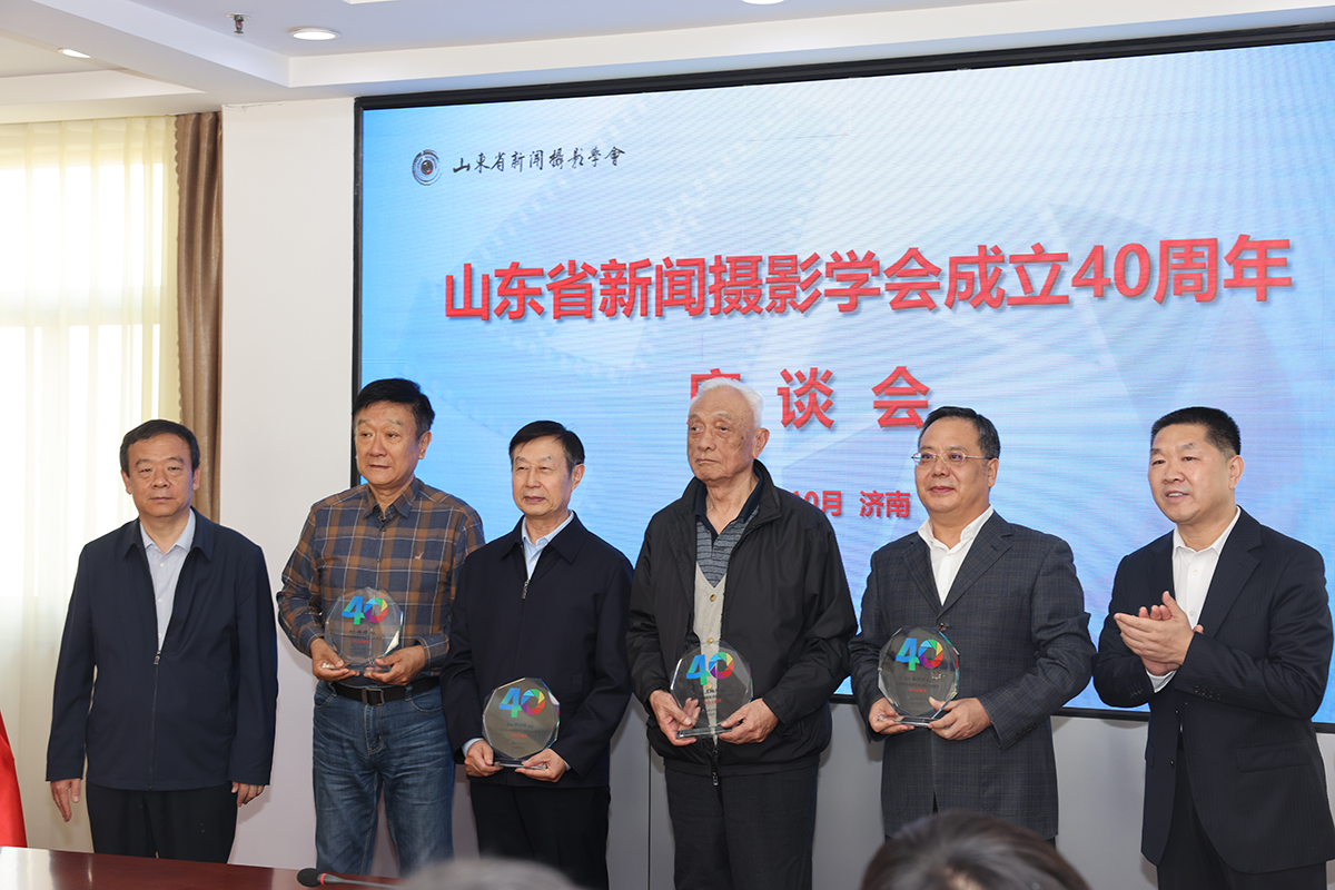 座谈会上,王邵军、王洪亮为时盘棋、朱宜学、许衍刚、王修滋、王瑞华、钱捍颁发山东新闻摄影学会成立40周年“突出贡献奖”。