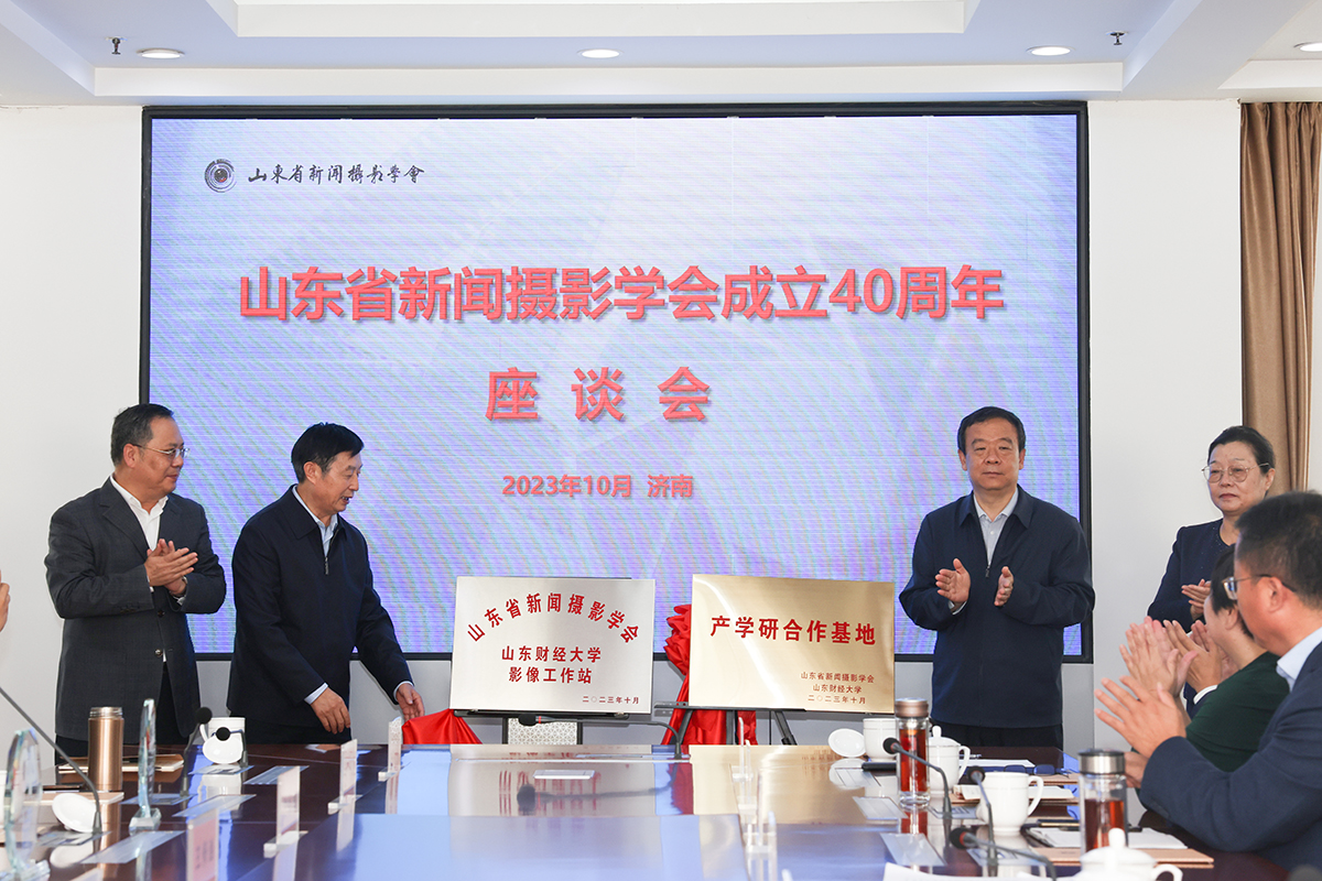 王邵军、陈晓兰、许衍刚、王修滋共同为山东省新闻摄影学会驻山东财经大学影像工作站和产学研合作基地揭牌。