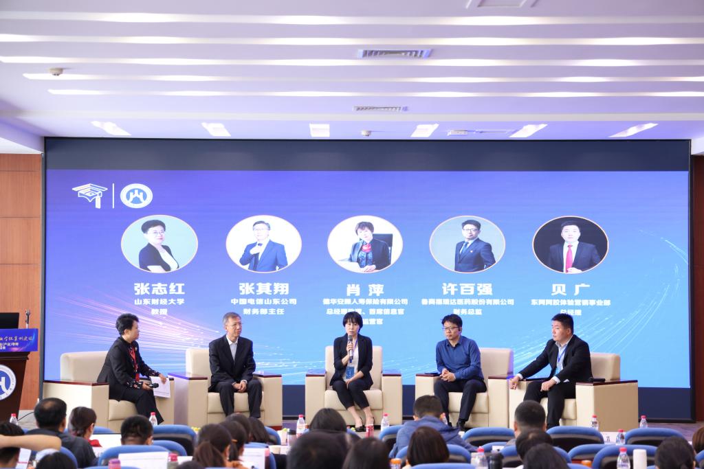 圆桌会议环节,山东财经大学张志红教授与德华安顾人寿保险有限公司总经理助理肖萍,中国电信山东公司财务部主任张其翔,鲁商福瑞达医药股份有限公司财务总监许百强,东阿阿胶体验营销事业部总经理贝广四位嘉宾精彩互动。嘉宾们围绕企业参与高校案例建设的动因、企业开展案例研究的困难、校内外导师在研究生培养中如何联动形成合力等话题进行了讨论。