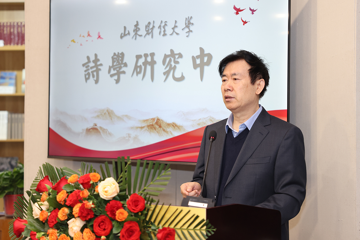 赵艺丁在致辞中对诗学研究中心的成立表示热烈的祝贺,认为这是山东财经大学为传承中华文化、推动文化繁荣所做的一件大事、好事,也是全省文学界非常值得庆贺的一件大事、喜事。他在回顾了山东自古以来的优良文学传统、阐述了当代山东文学以及山东诗坛的创作盛况后,祝愿我校诗学研究中心在今后的诗学创作和研究中,扎根齐鲁文化沃土,赓续历史文脉,谱写当代华章,开展多层次、全方位的文学艺术创作及理论研究,把诗学研究中心打造成为国内独具特色、实力雄厚的诗学文化研究基地,为推进文化强省建设、打造中华民族现代文明高地做出积极贡献。