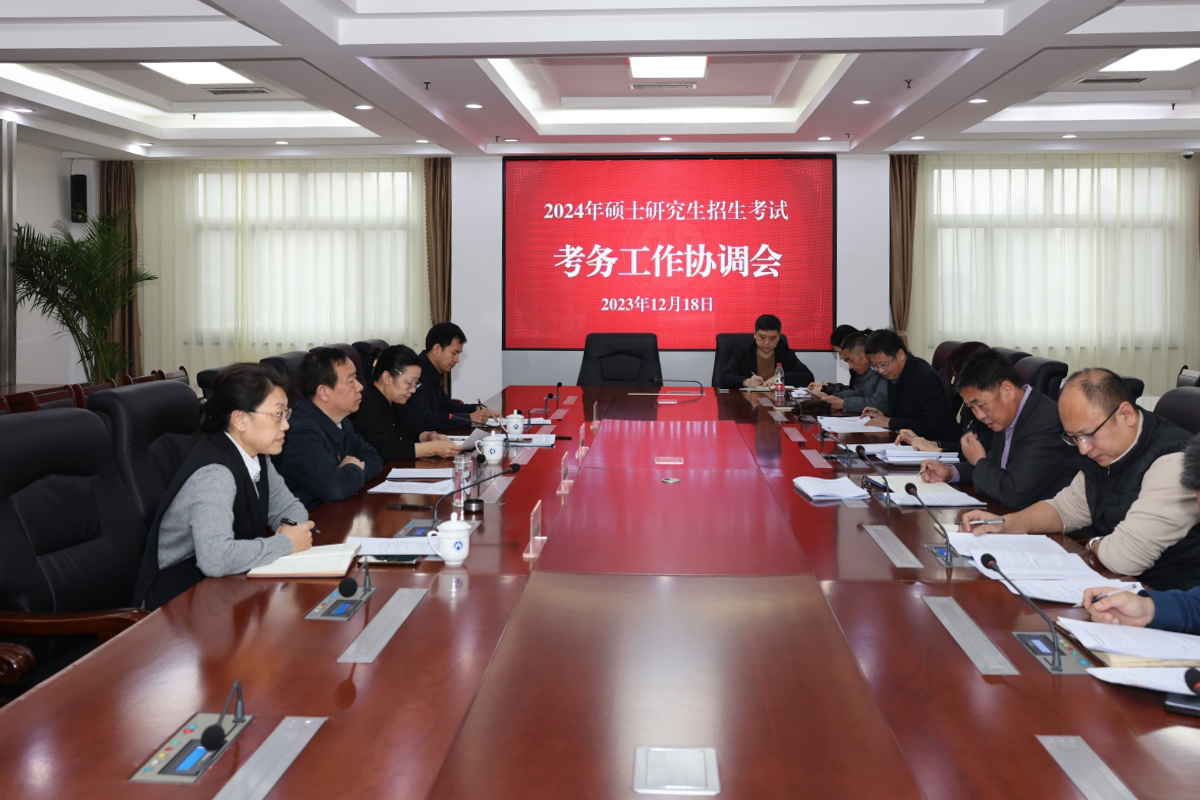 为平稳有序做好我校2024年硕士研究生招生考试组考工作,12月18日,我校召开2024年硕士研究生招生考试考务工作协调会。校党委书记王邵军,副校长陈晓兰、张红霞、谢申祥出席会议。副校长陈晓兰主持会议。