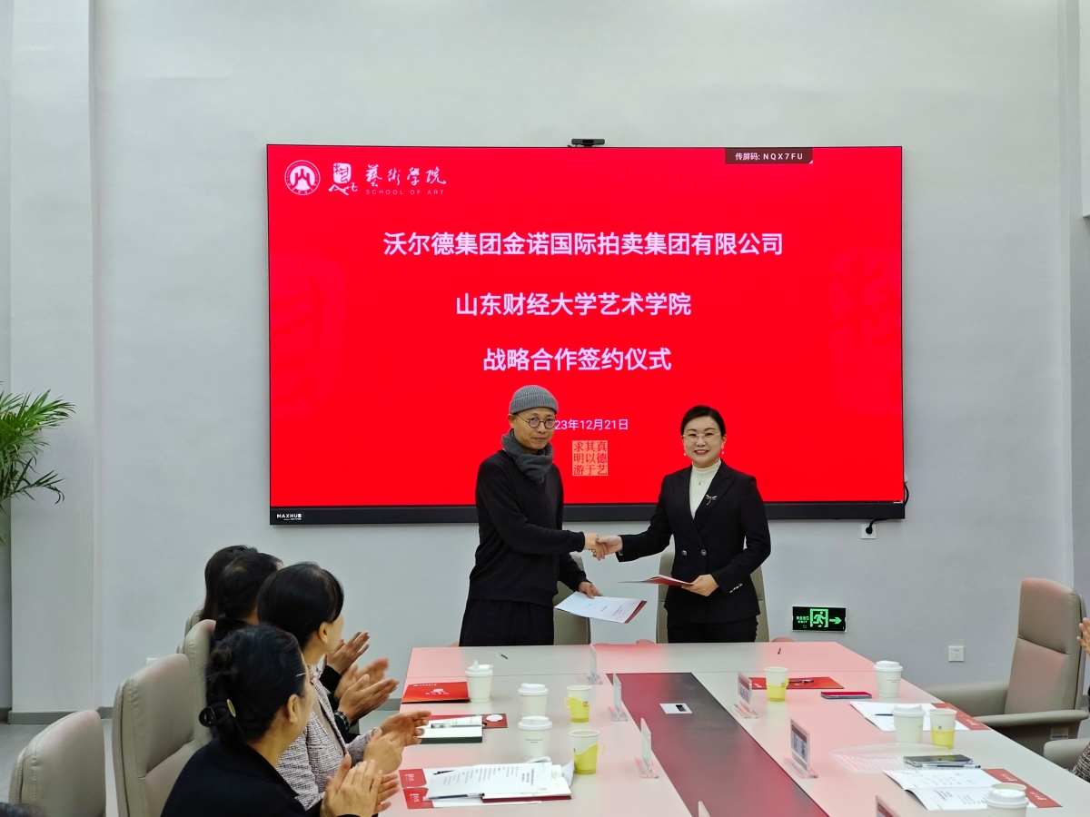 12月21日,艺术学院与金诺国际拍卖集团有限公司战略合作签约仪式在燕山校区举行,副校长陈晓兰出席仪式并致辞。沃尔德集团总裁商雪梅、金诺国际拍卖集团有限公司总裁位琳、副总裁主金坤、总裁助理杨晓清,艺术学院领导班子、教师代表参加活动。