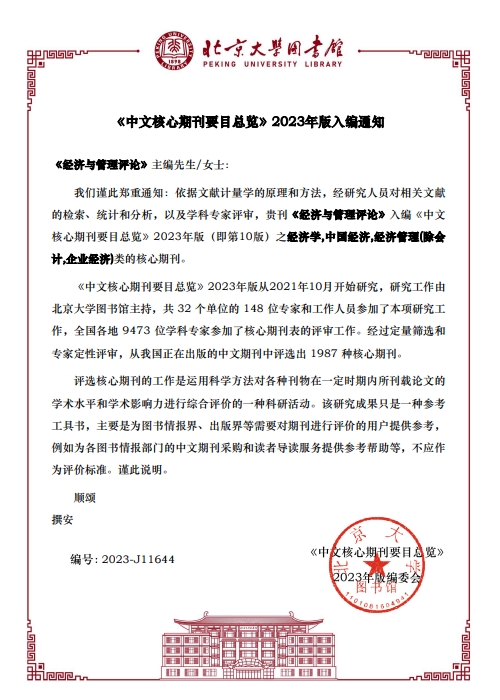 近日,北京大学图书馆发布《中文核心期刊要目总览》2023年版。《经济与管理评论》入编《中文核心期刊要目总览》2023年版(即第10版)之经济学,中国经济,经济管理(除会计,企业经济)类的核心期刊。这是《经济与管理评论》继入围《中文核心期刊要目总览》2017年版、2020年版后的第三次入围,是对《经济与管理评论》办刊质量的充分肯定。