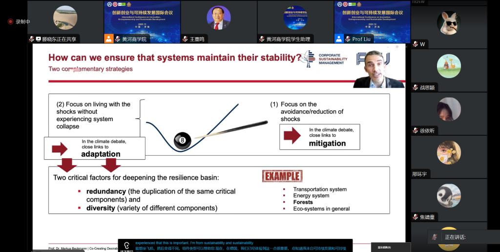 本次会议以创新创业及可持续发展为主题,聚焦创新与创业在促进社会经济可持续发展中的理论与实践,邀请国内外相关领域专家学者分享当下最新的研究成果和经验教训。来自美国威斯康辛大学、德国埃尔朗根-纽伦堡大学、以色列学术研究管理学院、英国利兹大学、杜伦大学、西班牙格拉纳达大学等多家海外高校、山东省工业互联网协会等国内机构、企业嘉宾、在校师生等70余人线上参与。
