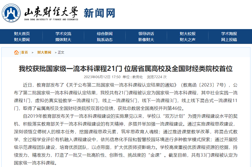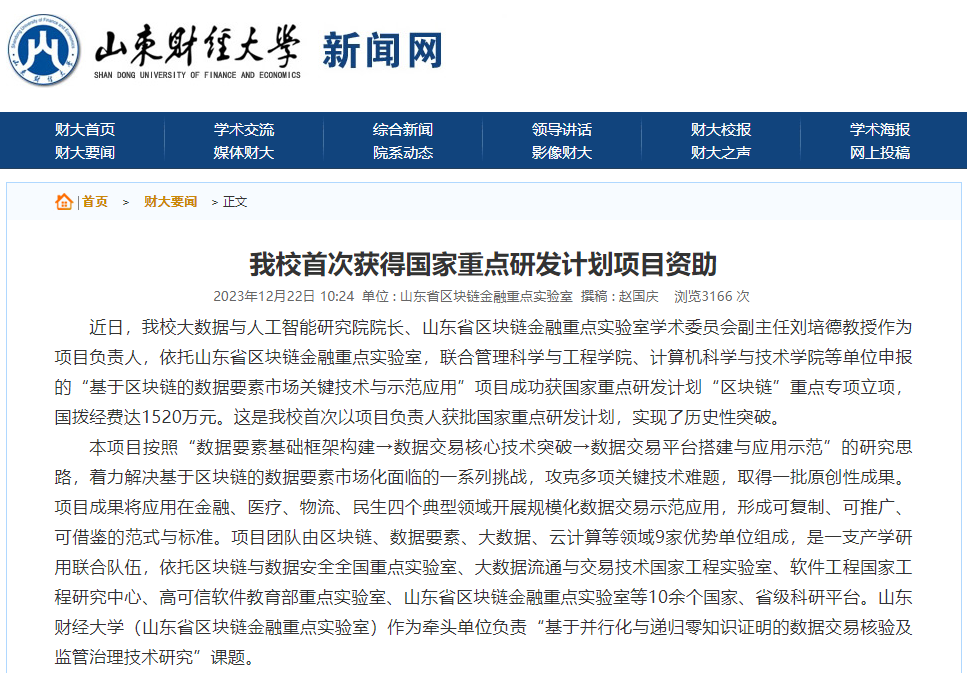 5.科学研究与社会服务量质齐升。首次获批国家重点研发计划资助,国拨经费1520万元,实现历史性突破。获准立项国家级项目35项,其中国家社科基金年度和青年项目立项23项,立项数位列省属高校第2位、财经类高校第5位、全国立项单位第52位。获批研究阐释党的二十大精神国家社科基金重点项目1项、国家社会科学基金哲学社会科学领军人才项目1项。获批山东省社科项目44项,居省属高校首位。获山东省第36届社科优秀成果奖29项,其中特等奖1项、一等奖5项、二等奖6项、三等奖17项,获奖数位居省属高校第2位。与省委政法委合作建设一站式矛盾纠纷化解线上平台,项目合同金额为1489万元。
