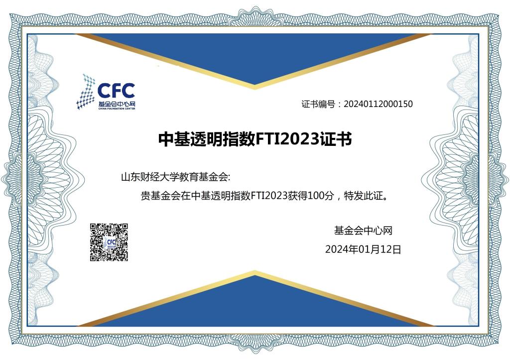 1月12日,中国基金会行业数据发布会在北京召开,会议发布了中基透明指数FTI2023报告。山东财经大学教育基金会获得了满分100分的成绩,透明等级A+,排名并列全国第一,是山东省省属高校唯一一家获得满分的基金会。