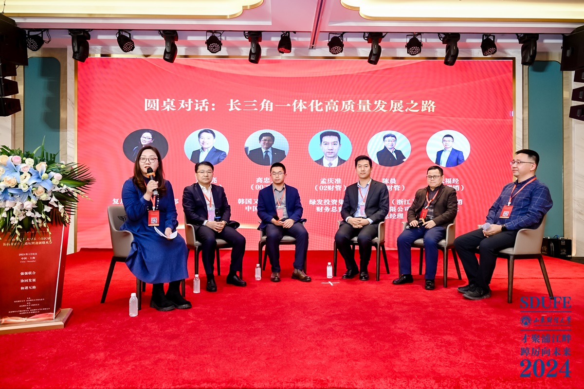 圆桌论坛环节,复星集团重大项目部总经理、01级牛彦红,山东良福制药董事长、90级刘洪亮,申西认证总经理、96级张文均,韩国又松教育集团中国区负责人、00级高忠义,中国绿发投资集团财务总监、02级孟庆准,彼亿营销董事长、05级张福经等校友就“长三角一体化高质量发展之路”展开探讨。