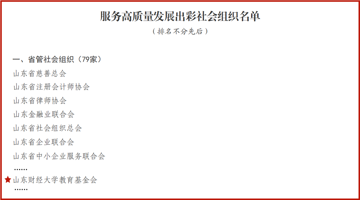 近日,山东省民政厅发布了《关于公布服务高质量发展出彩社会组织名单的通知》。山东财经大学(校友会)教育基金会入选山东省服务高质量发展出彩社会组织。