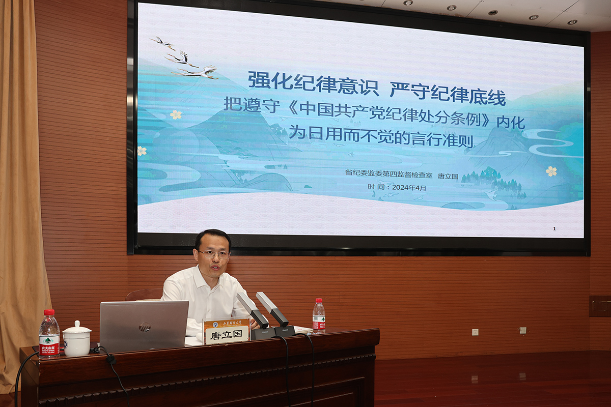 4月23日下午,山东省纪委监委第四监督检查室副主任、一级调研员唐立国应邀来我校,在燕山校区作题为《强化纪律意识,严守纪律底线,把遵守<中国共产党纪律处分条例>内化为日用而不觉的言行准则》的专题辅导报告。唐立国在报告时表示,这次党纪学习教育是加强党的纪律建设、推动全面从严治党向纵深发展的重要举措。党的十八大以来,党中央先后三次修订《条例》,党的纪律规矩十分明确、日益完善。他紧扣习近平总书记重要指示批示精神,紧扣党中央部署和省委要求,围绕学习《条例》的重大意义,准确把握《条例》修订的主要内容和精髓要义,切实做到增强纪律意识、筑牢纪律底线,把铁的纪律内化为日用而不觉的言行准则等三个方面,联系具体案例和高校实际,作了详细阐述和专题辅导。学校领导、全体中层干部、学生党员代表在现场听取了报告。
