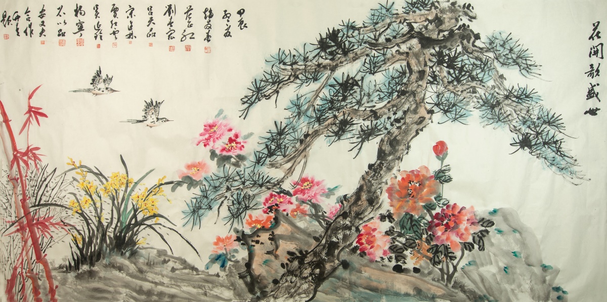 设在艺术学院多功能厅的笔会现场,名家云集,欢声笑语,大家在欢欣鼓舞的气氛中开展精心创作,以书言志、以画寄情。近三个小时,大家不仅各显专长,创作出风格迥异的佳品力作,还融通共识,集体创作完成了八尺整张的《花开歌盛世》精品国画一幅,该作品构图以盛开的牡丹、水仙等吉祥花卉衬托遒劲傲骨的苍松,蕴含着艺术家们对新时代教育事业这一百年基业大繁荣大发展的盛情期待和对我校财经特色名校建设的美好憧憬。笔会作品精彩纷呈,主题鲜明,书法作品《坚如磐石》《大业千秋》《继往开来》《笃行致远》《凝心聚力汇共识,擘画蓝图启新程》等字字铿锵,表达了对党的坚强领导的高度认同和衷心拥护、对学校美好前景的热切期盼。国画作品《祯祥富贵图》《雨后春笋》等充分表达了艺术家们对幸福美满生活的珍视与热爱,坚守初心、接续奋斗,共同开创美好前程。