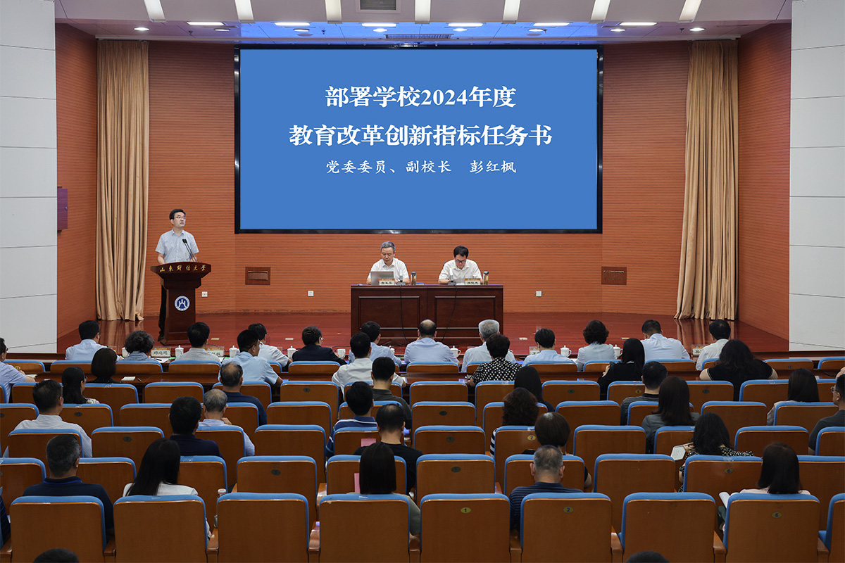 副校长彭红枫代表学校下达部署了学校2024年度高质量发展指标任务,对教学院部、科研机构教育改革创新指标任务书制定以及下一步推进任务落实情况作了说明。他提出,要把推进“一校一书”“一院一书”作为推动学校、学院高质量发展的重要抓手,切实做到统筹谋划、协同发力、一体推进。要加强对标对表分析,深入查摆问题和短板,拉高标杆、开拓思路、大胆创新,以指标任务要求倒逼工作落实,把相关任务融入、贯穿各项工作的谋划、落实全过程,统筹推进学校第二次党代会各项任务落实。