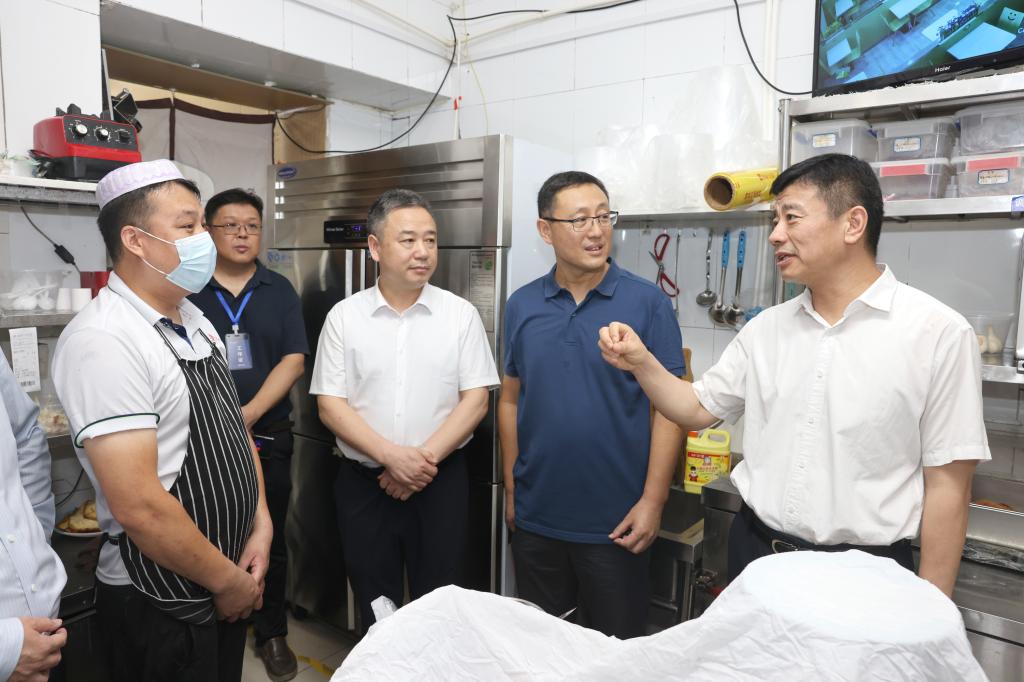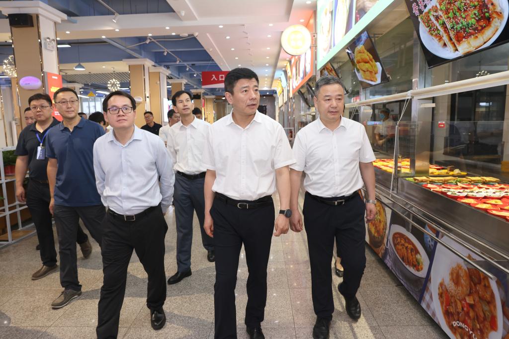 在东苑餐厅二楼,李明实地考察了就餐环境,深入了解暑期餐厅的开放时间、就餐容纳人数及各窗口饭菜配备和价格等情况。他还走进民族餐厅后厨,察看菜品制作流程,并与厨师亲切交流。李明指出,要切实提高政治站位,认真做好暑期留校学生的饮食服务保障工作,确保食堂食品安全卫生,保障师生健康以及暑期校园安全。