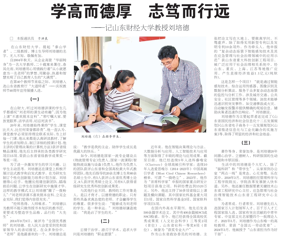 在第40个教师节来临之际,刘培德入选山东省教育厅“大道师者”——庆祝教师节40周年宣传展播人选。
