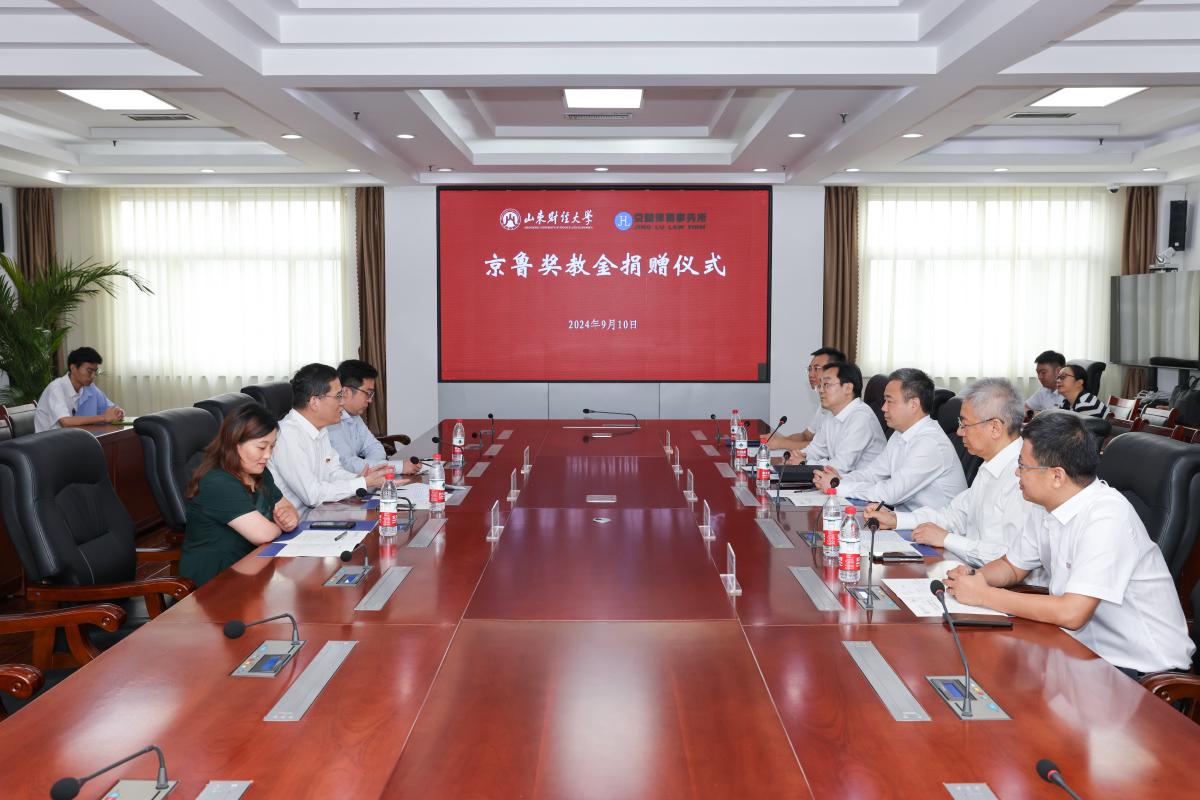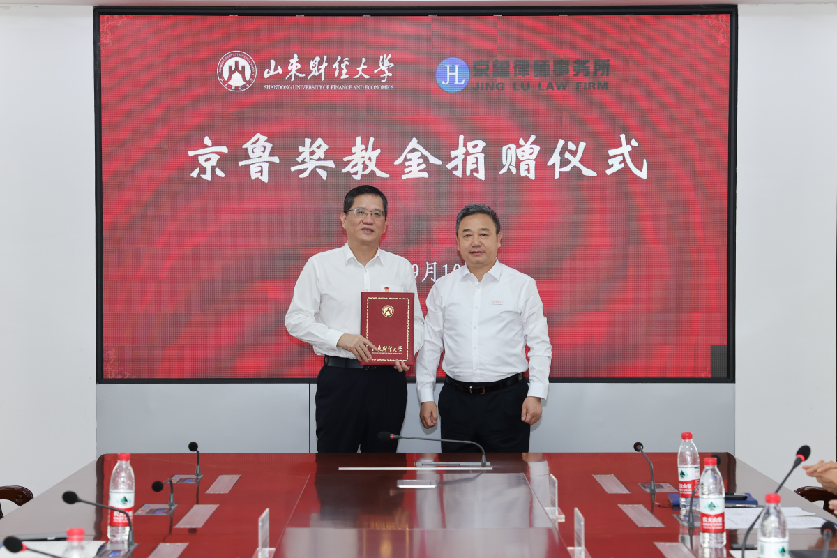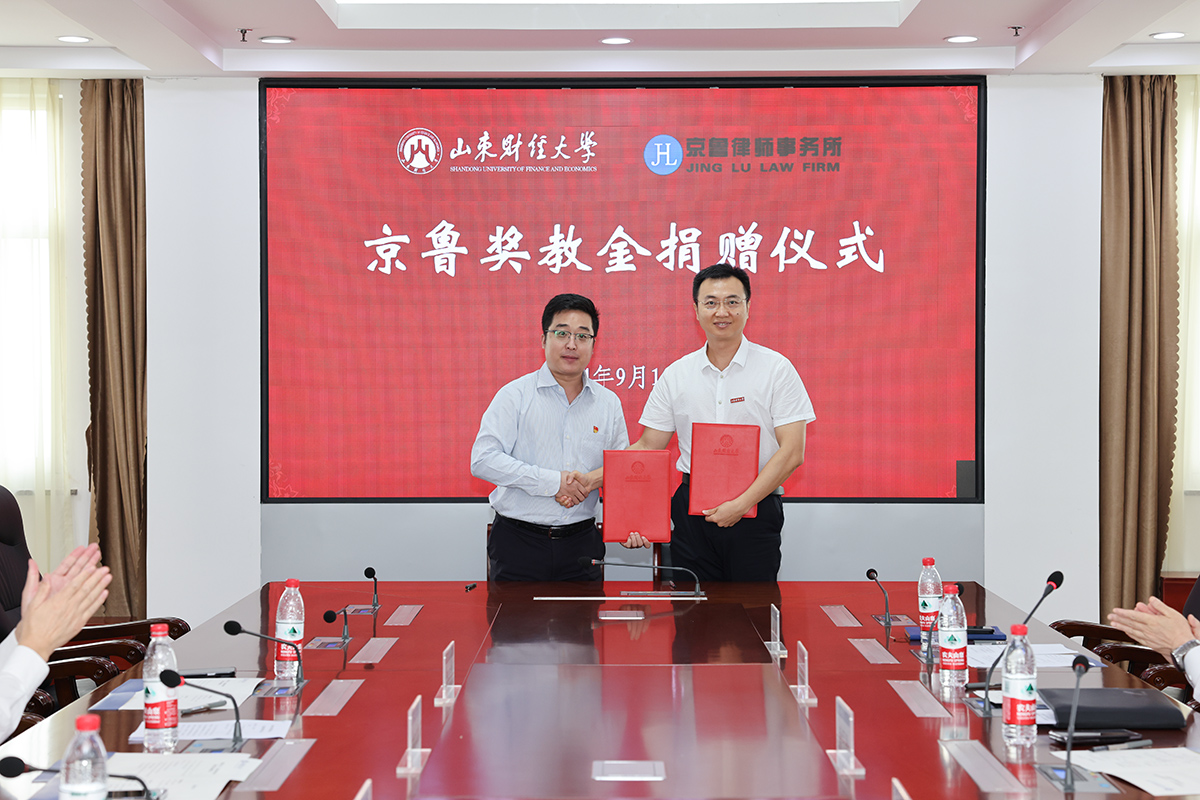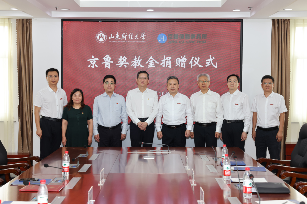 9月10日上午,“京鲁奖教金”捐赠仪式在山东财经大学燕山校区七楼会议室举行。山东京鲁律师事务所创始人、党支部书记郝纪勇,副书记、我校2010级校友孙京祥,合伙人律师、我校1999级校友王化芬,学校党委书记查玉喜,副校长张新参加捐赠仪式并进行座谈,副校长王敬政主持捐赠仪式。