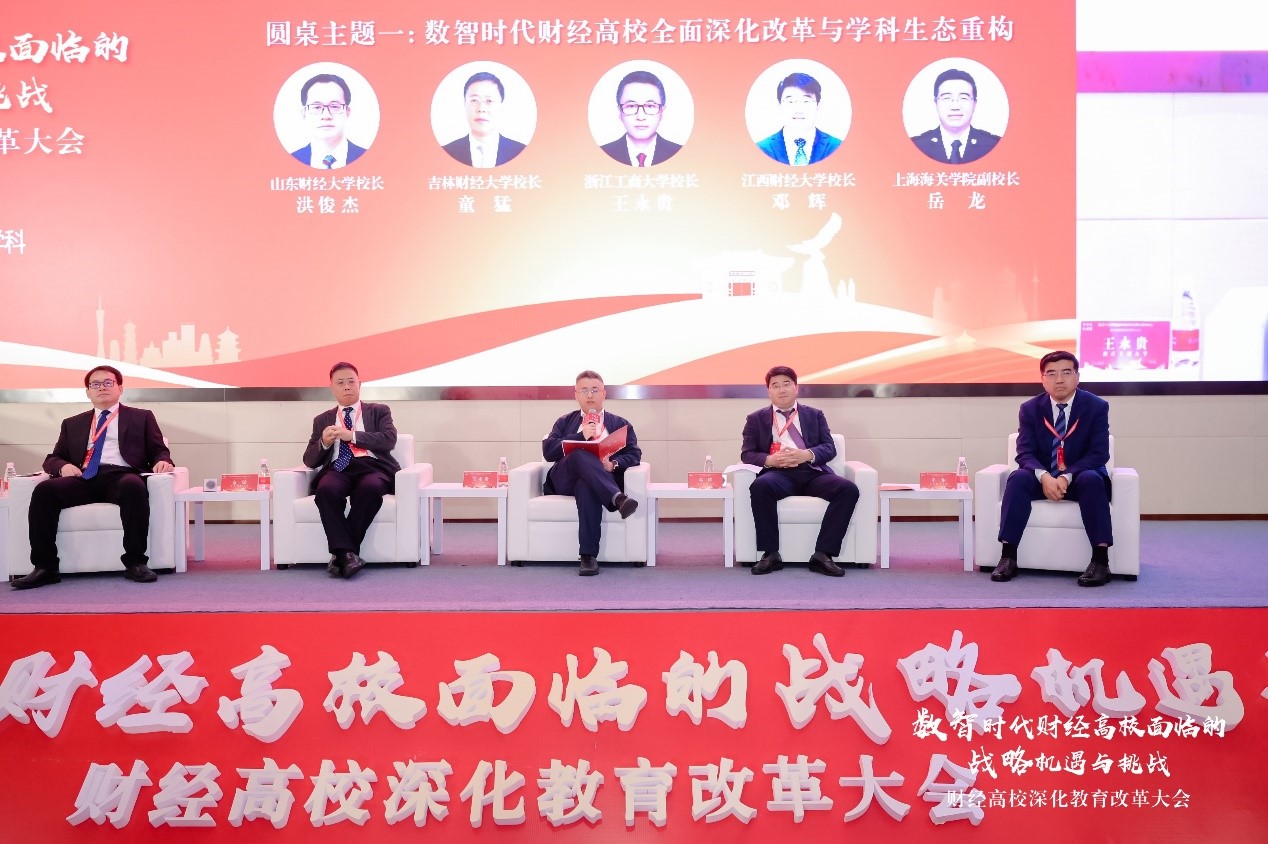 圆桌论坛以“数智时代财经高校全面深化改革与学科生态重构”为主题。论坛上,洪俊杰指出,数智时代如汹涌浪潮来袭,正冲击着财经高校的传统发展模式。数据显示,近5年来,全球金融行业中与大数据、人工智能相关的岗位需求增长了80%,而传统金融岗位需求则下降了约30%,清晰地表明了财经高校所面临的严峻形势,全面深化改革和学科生态重构已迫在眉睫。他表示,山东财经大学持续强化顶层设计,不断凝练目标思路,充分发挥理工科优势,颁布实施人工智能赋能教育教学421行动方案,发布“AI”教育教学专有大模型,通过大数据、机器学习、知识图谱等关键技术,搭建智能科教环境,打造具有专业性、个性化、系统性、一站式特点,集“知”“教”“学”“研”“训”“智”为一体的教学科研服务平台。这在全省乃至全国范围内发挥了示范引领作用。吉林财经大学校长童猛、浙江工商大学校长王永贵、江西财经大学校长邓辉,上海海关学院副校长岳龙分享了各自学校的经验做法。