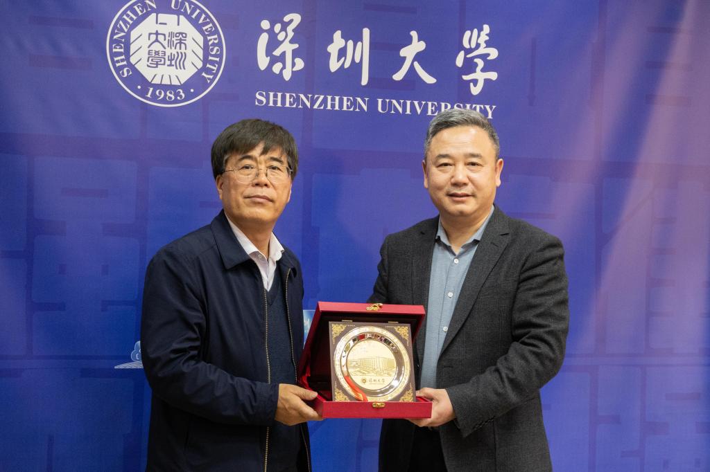 查玉喜介绍了学校的发展历史和学科专业发展情况,期待通过两校的深入交流和互动,推动双方在教师交流、学科共建等方面开展深入合作。深圳大学副校长汪永成向学校赠送了该校文创盘。
