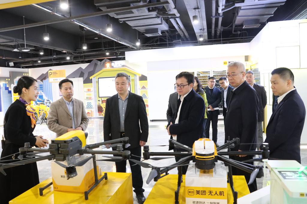 在美团华南区总部,学校一行现场观摩美团无人机、无人配送车等技术产品,深入了解智能驱动下美团的创新能力建设。双方就低空物流、无人机配送、消费大数据应用、在线新经济发展等领域进行了沟通交流。