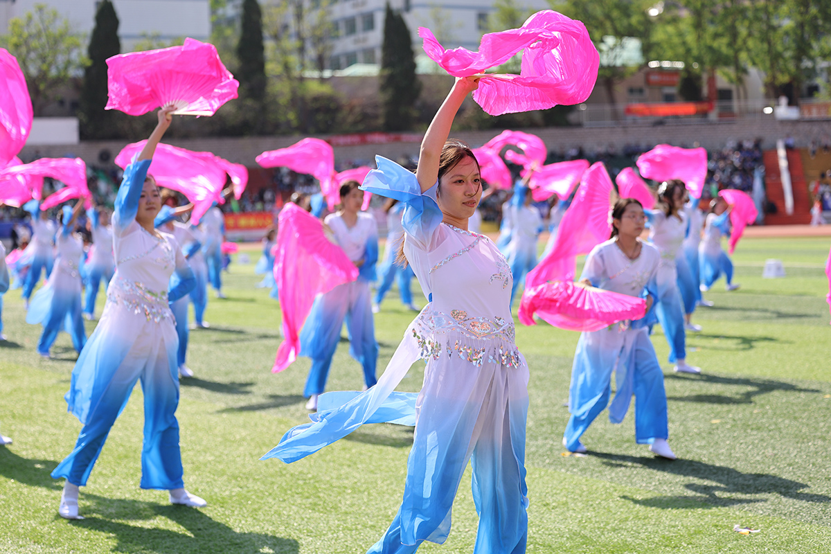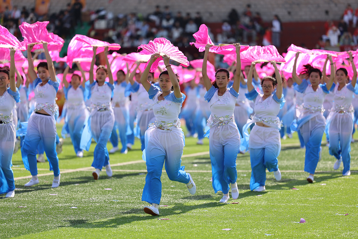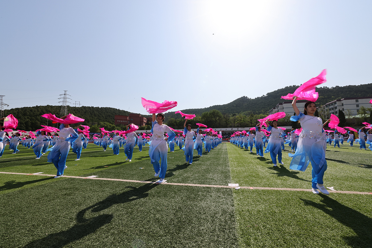 团体操《火炬花语》由16个学院的300余名学生完成,律动的舞姿和变换的队形展现了青春的力量与团结的精神。