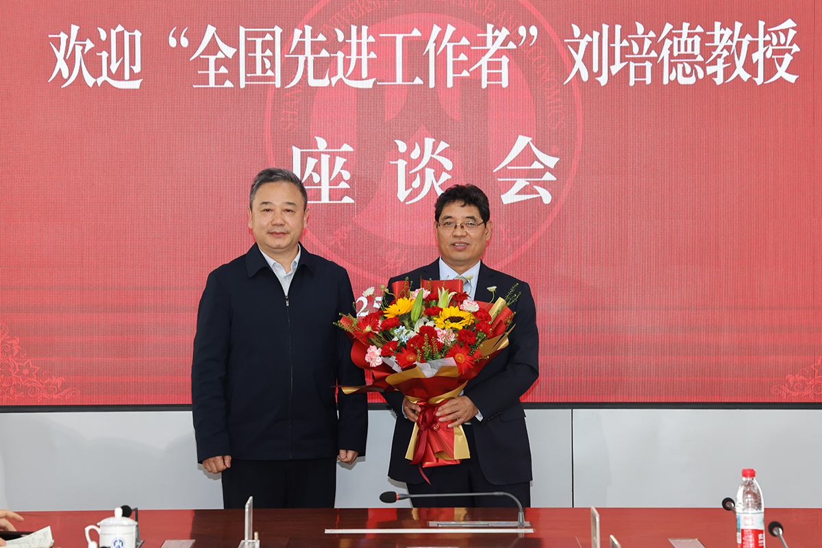 在全场热烈的掌声中,查玉喜向刘培德献上鲜花,代表学校党委以及全校师生表达对他的诚挚祝贺,感谢他为学校赢得了国家奖励、至高荣誉。