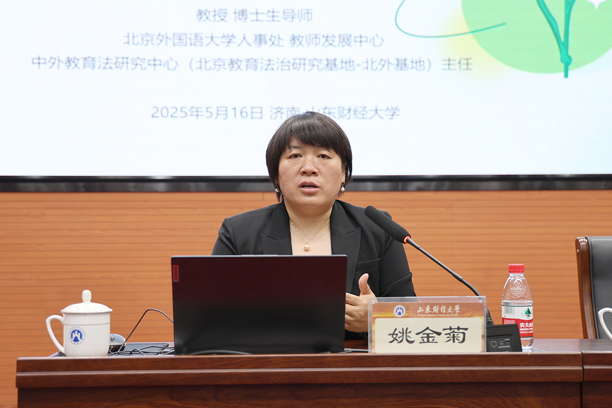 会议特邀曾参与教育部《关于建立健全高校师德建设长效机制的意见》《新时代高校教师职业行为十项准则》等规范的起草工作,北京外国语大学法学院教授、博士生导师姚金菊作了题为《教育强国背景下高校师德师风建设长效机制的法治解读》的报告。姚金菊结合自己的工作经历和思考,从时代背景与教育初心、职业行为准则的法律依据及负面清单、违反职业行为准则的处理等方面展开,系统深入地剖析了《新时代高校教师职业行为十项准则》产生的时代背景和法律依据,结合案例详细阐述了师德师风的“底线”与“红线”。报告高屋建瓴、逻辑严密、内容丰富,政策解读翔实、案例剖析深入、措施建议得当,受到了听众欢迎。