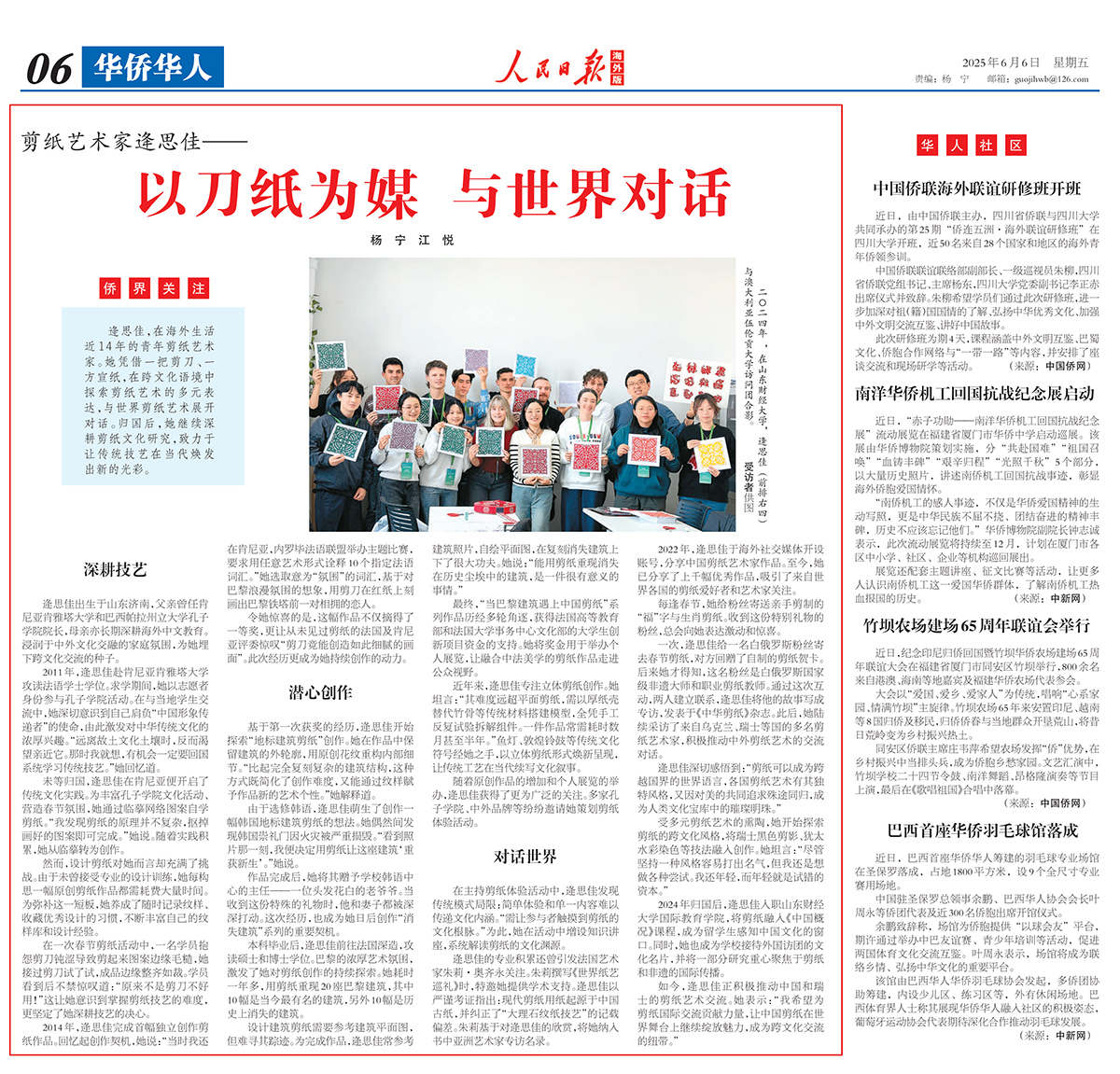 如今,逄思佳正积极推动中国和瑞士的剪纸艺术交流。她表示:“我希望为剪纸国际交流贡献力量,让中国剪纸在世界舞台上继续绽放魅力,成为跨文化交流的纽带。”(杨 宁、江 悦)文章来源:《人民日报海外版》(2025年06月06日 第 06 版)