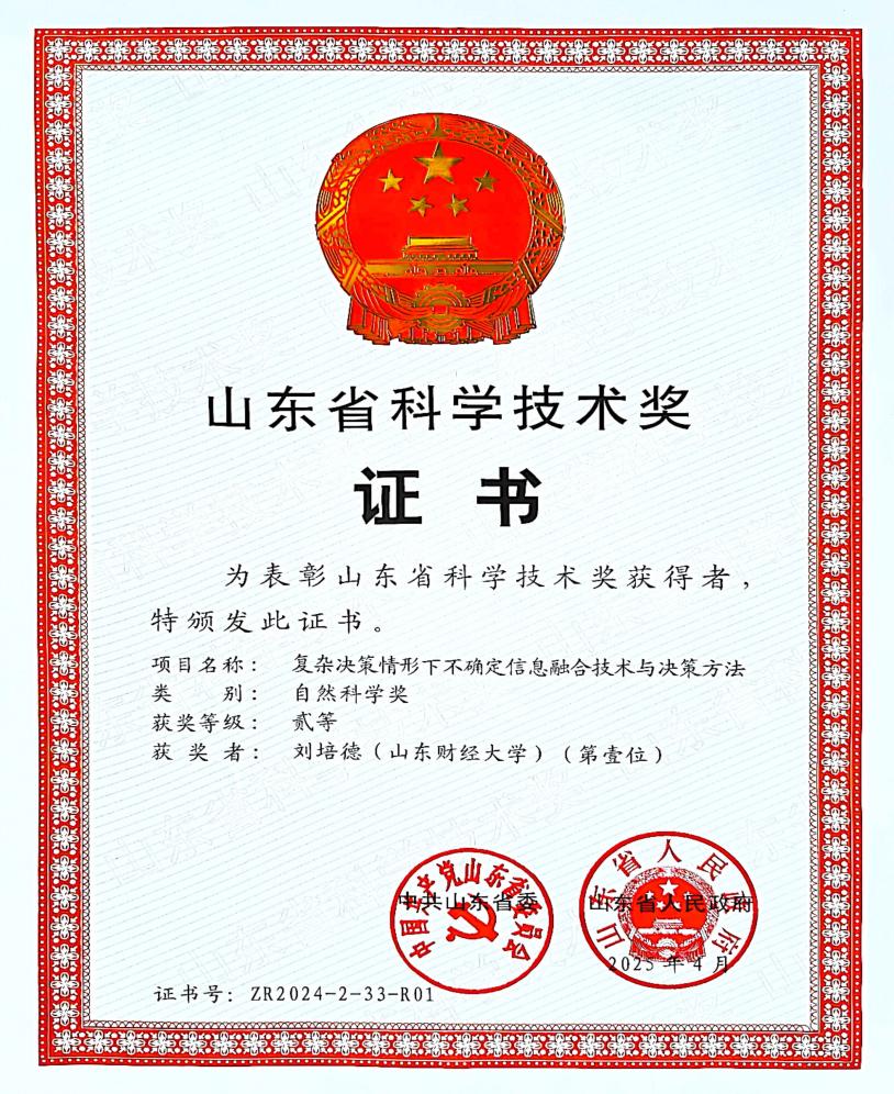 在山东省科学技术奖评选中,我校刘培德教授团队的研究成果《复杂决策情形下不确定信息融合技术与决策方法》荣获山东省自然科学奖二等奖。该成果在复杂决策理论与方法研究领域取得突破性进展,其提出的创新性解决方案不仅具有重要的理论价值,更在信息融合与智能决策实践中展现出广阔的应用前景。