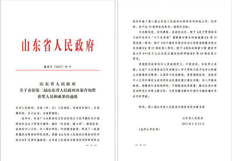 在山东省人民政府决策咨询奖评选中,我校4位教师获得表彰,获奖数量位居全省高校前列。其中,苏昕教授团队的研究成果《关于打造氢能产业链闭环系统,加快氢能强省建设的对策建议》获二等奖;杨骞教授团队的研究成果《统筹做好人财物三篇大文章,为深入打造乡村振兴齐鲁样板提供有力保障》获三等奖;赵明亮教授作为第三完成人参与的研究成果《高质量推进我省财政资源统筹的几点建议》获一等奖;新引进人才张鲁秀教授在济南大学工作期间主持完成的研究成果《关于加快推动数据链建设,驱动专精特新小企业高质量发展的建议》获二等奖。这些获奖成果紧密围绕山东省重大发展战略需求,在新能源、乡村振兴、财政管理、数字经济等重点领域形成了具有重要参考价值的研究成果,充分彰显了我校在决策咨询领域的学术影响力和社会服务能力。