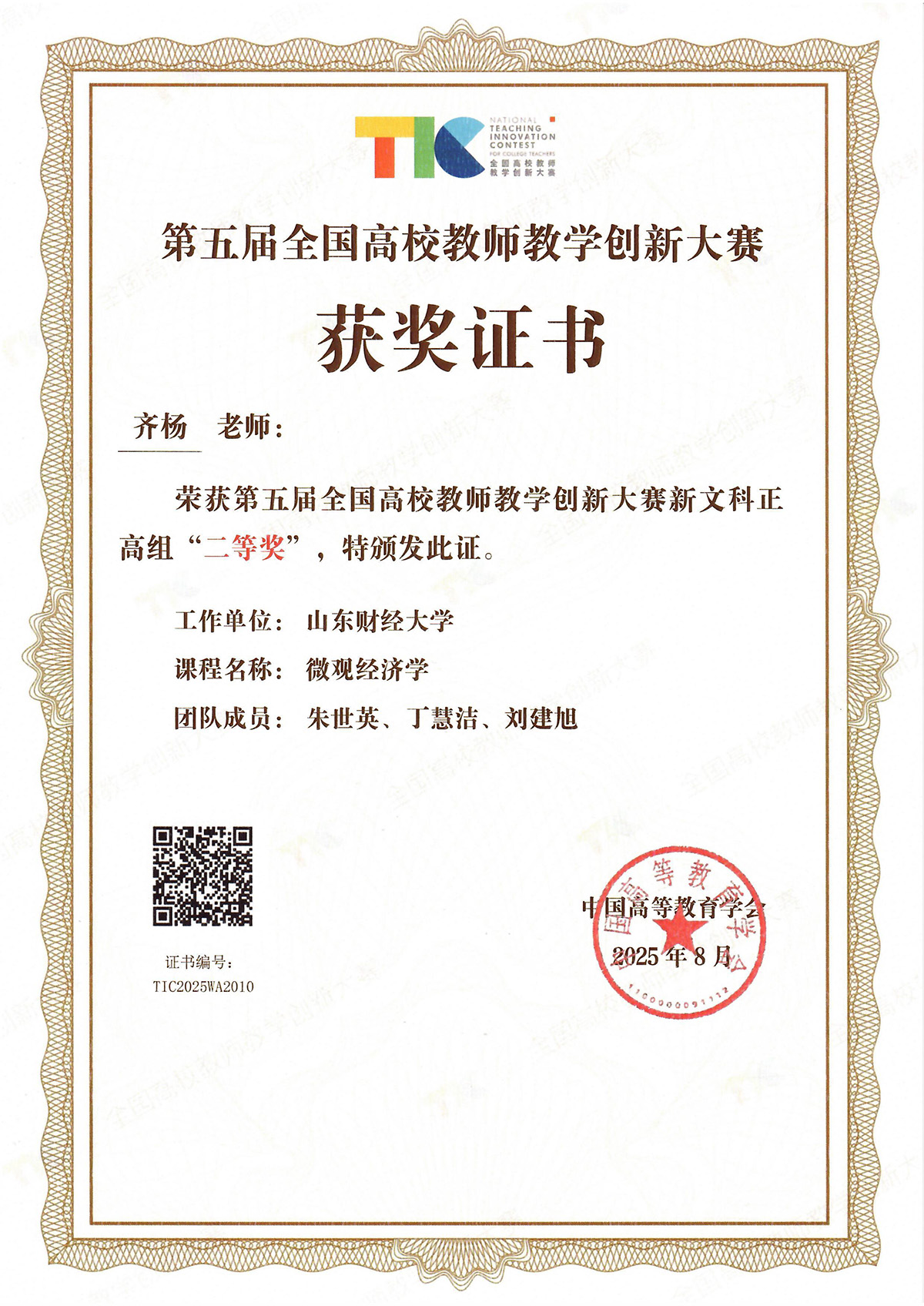 8月16日至19日,第五届全国高校教师教学创新大赛决赛在北京理工大学举行,我校经济学院教授齐杨团队(成员:朱世英、丁惠洁、刘建旭)所讲授课程《微观经济学》斩获新文科正高组全国二等奖。