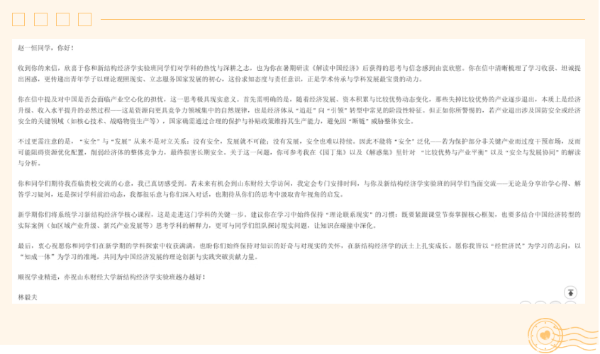 赵一恒在信中谈到,《解读中国经济》让他对中国经济发展逻辑有了更清晰的认知,也更加坚定了“以所学服务国家经济发展”的决心。同时,他结合美国因产业空心化引发贸易逆差扩大、底层民生困难等后果,以及国内部分地区劳动力成本上升、产业外流的现象,询问“中国未来是否会面临类似产业空心化风险”。信的最后,他代表班级全体同学表达了深耕新结构经济学的信念,并期盼林毅夫教授能够莅临学校进行指导交流。