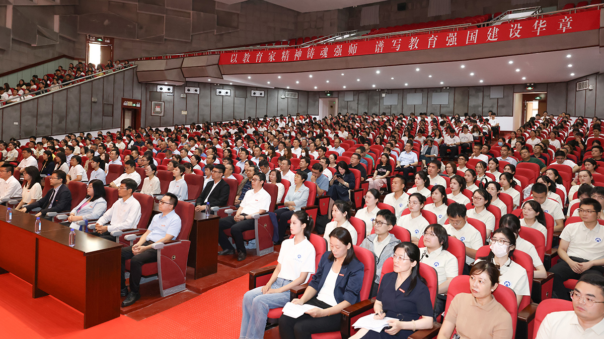 会前,会场大屏幕播放学校宣传片和校歌《梦想花开》MV,正后方高悬“以教育家精神铸魂强师 谱写教育强国建设华章”的大红横幅,气氛隆重热烈。