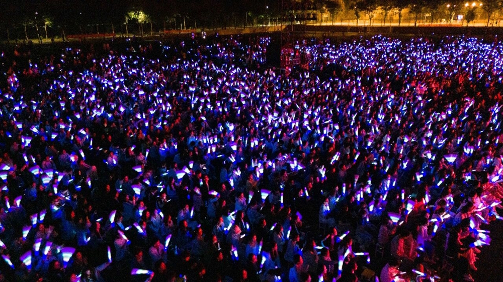 观众席间,新生深受感染、热情高涨,共同挥舞荧光棒,跟随音乐,放声合唱。