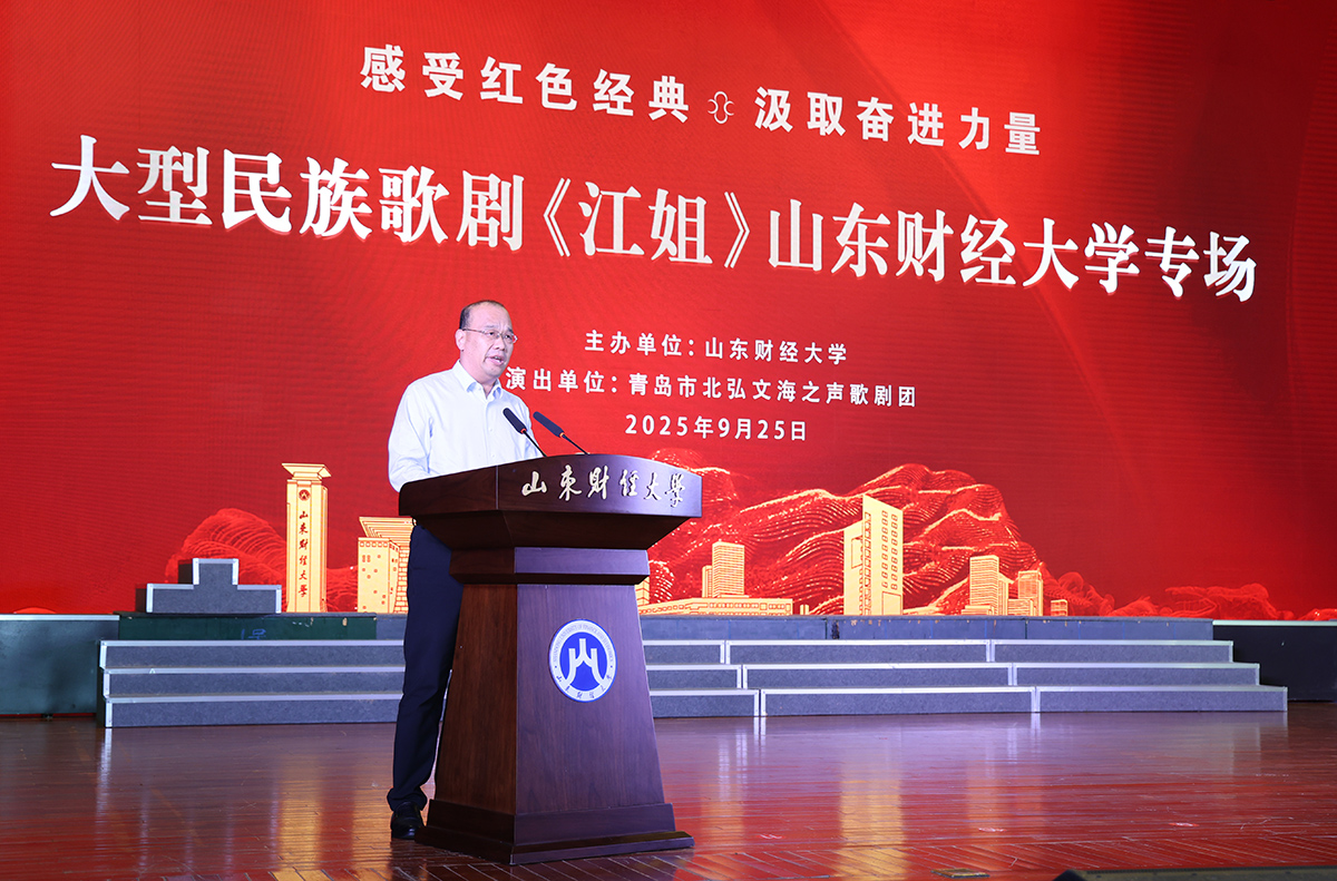 演出开始前,张培国致辞。他代表学校向出席活动的领导、来宾及媒体记者表示热烈欢迎和衷心感谢,表示在举国上下隆重纪念中国人民抗日战争暨世界反法西斯战争胜利80周年、喜迎新中国成立76周年华诞之际,民族歌剧《江姐》走进山东财经大学,可谓恰逢其时、意义重大。张培国简要介绍了学校的基本情况。他表示,学校自第二次党代会召开以来,高度重视挖掘红色历史文化资源,丰富完善红色文化的思想教育体系,打造红色文化传承的“财大样板”,着力培养德智体美劳全面发展的“时代新人”。红色经典具有历久弥新的生命力和跨越时空的穿透力。红色经典走进校园,与思政育人深度结合,不仅是对历史的重温回望,更是对红色血脉的传承弘扬。他指出,此次歌剧《江姐》来校专场演出,是学校持续深入学习贯彻习近平文化思想的务实举措,也是深化“文化建设年”的有力抓手。对广大师生特别是青年学生来说,是一场精彩纷呈的视听盛宴,一堂别开生面的思政大课、更是一次触及灵魂的精神洗礼。