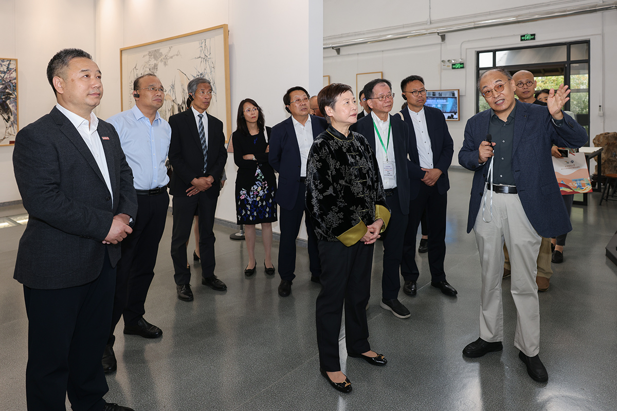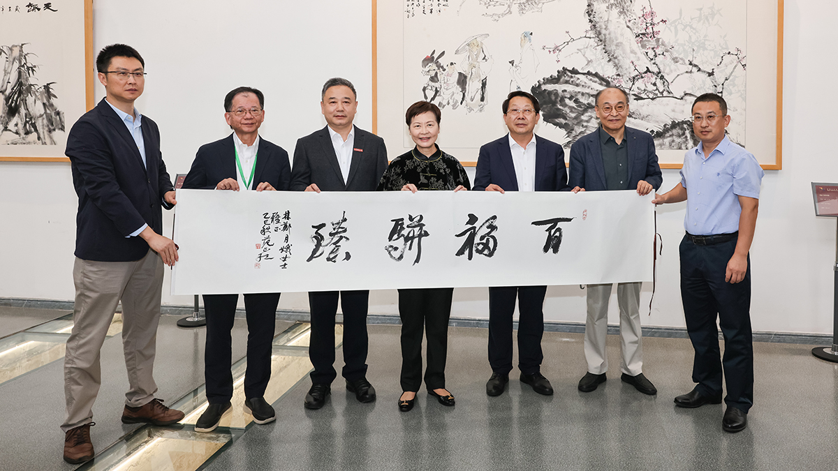 到达学校燕山校区后,林郑月娥一行在查玉喜、张培国的陪同下,首先参观了海岱美术馆艺术作品展,听取了我校艺术学院名誉院长范正红教授对秦、汉、魏晋南北朝的碑刻原拓及当代艺术名家作品的介绍。林郑月娥对《泰山刻石》《张迁碑》等具有重要金石学和书法研究价值的拓片表现出浓厚兴趣,在《孔子见老子》等汉画像石拓片前反复观赏。范正红向林郑月娥赠送了作品集及书法作品“百福骈臻”。观展后,林郑月娥欣然题词:山东财经大学作育英才,香港是国际金融中心,期待山财大师生多到香港互动交流。