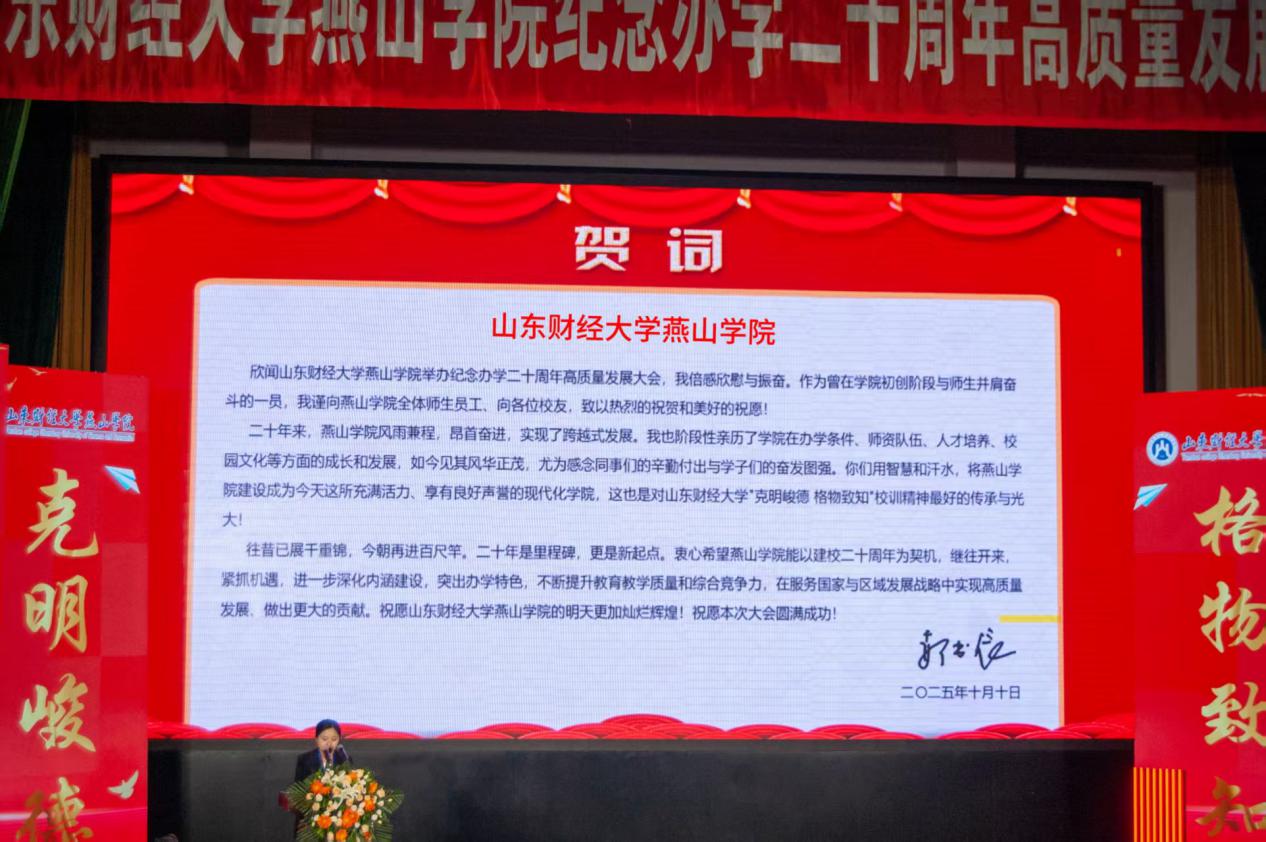 10月11日,山东财经大学燕山学院纪念办学二十周年高质量发展大会举行,大会以“薪火相传 同心致远”为主题,回顾二十年办学成就,展望未来发展蓝图。