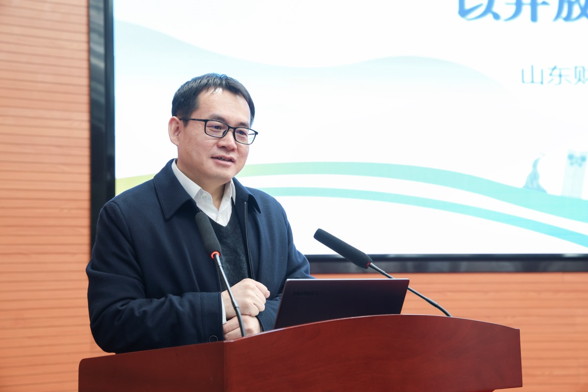 洪俊杰在致辞中代表学校向出席会议的各位嘉宾表示热烈欢迎。他回顾了学校1948年建校以来的发展历程与办学成就,重点介绍了2024年组建的“中国经济研究院”的相关情况,从研究方向、平台建设、合作交流与成果转化四个方面展示了研究院的建设成效。他表示,学校将持续强化智库智囊功能,为山东高质量发展提供智力支撑。