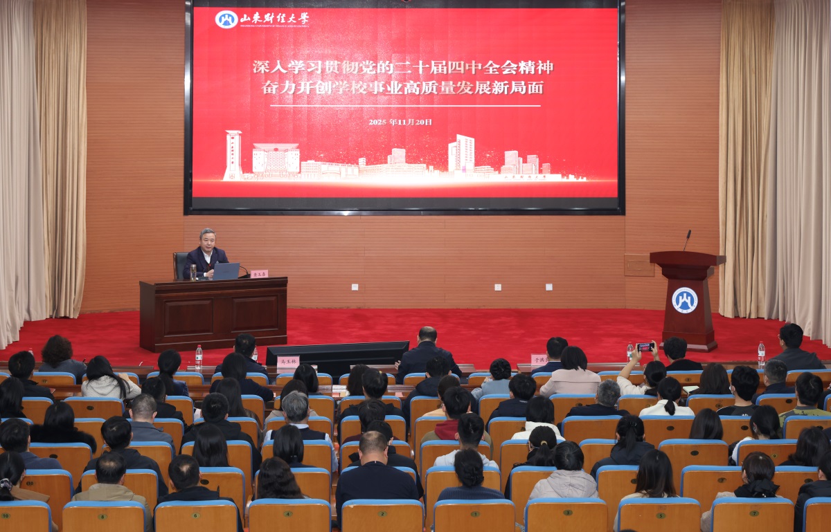 报告会上,查玉喜围绕学习贯彻党的二十届四中全会精神,对“十五五”时期在基本实现社会主义现代化进程中的重要地位,“十五五”时期经济社会发展的指导方针、主要目标、战略任务、重大举措,坚持和加强党的全面领导等,进行了深刻阐释和全面解读;并结合“十四五”期间山东经济社会发展取得的巨大成就,认真编制好学校“十五五”发展规划,加快推进高质量发展等进行了深入宣讲。