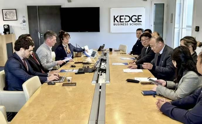 在马赛高等商学院,代表团与副校长高基克等开展深入会谈,双方就课程体系对接、联合开发数字贸易等特色课程,以及师生互访、科研共享等充分交流,对建立正式友好校际关系,在多个维度开展深度合作达成共识。马赛高等商学院始建于1872年,在全球拥有7个永久校区,是少数同时拥有美国商学院协会(AACSB国际)、欧洲质量改善系统(EQUIS)和英国工商管理硕士协会(AMBA)三大商科顶级认证的顶级商学院。