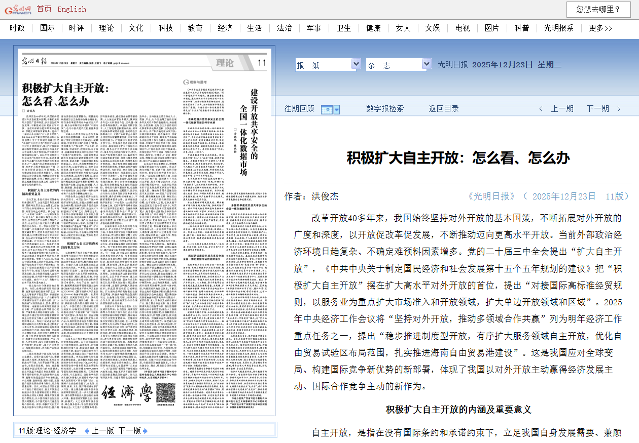 12月23日,《光明日报》刊发我校校长洪俊杰的理论文章《积极扩大自主开放:怎么看、怎么办》,全文5816字:
