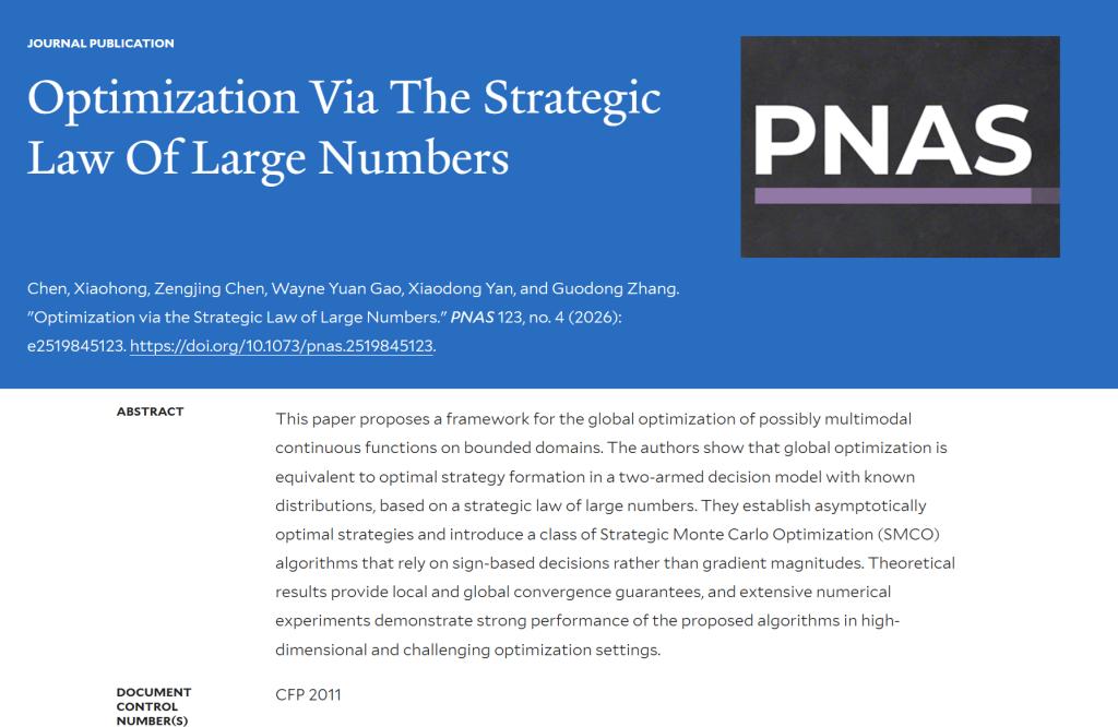 2026年1月,我校统计与数学学院预聘制教授张国栋作为同等贡献共同作者,与美国耶鲁大学Xiaohong Chen教授、山东大学陈增敬教授、美国宾夕法尼亚大学Wayne Yuan Gao教授、西安交通大学严晓东教授合作撰写的学术论文“Optimization Via The Strategic Law Of Large Numbers”,在国际顶级学术期刊《美国科学院院刊》(PNAS)正式发表。