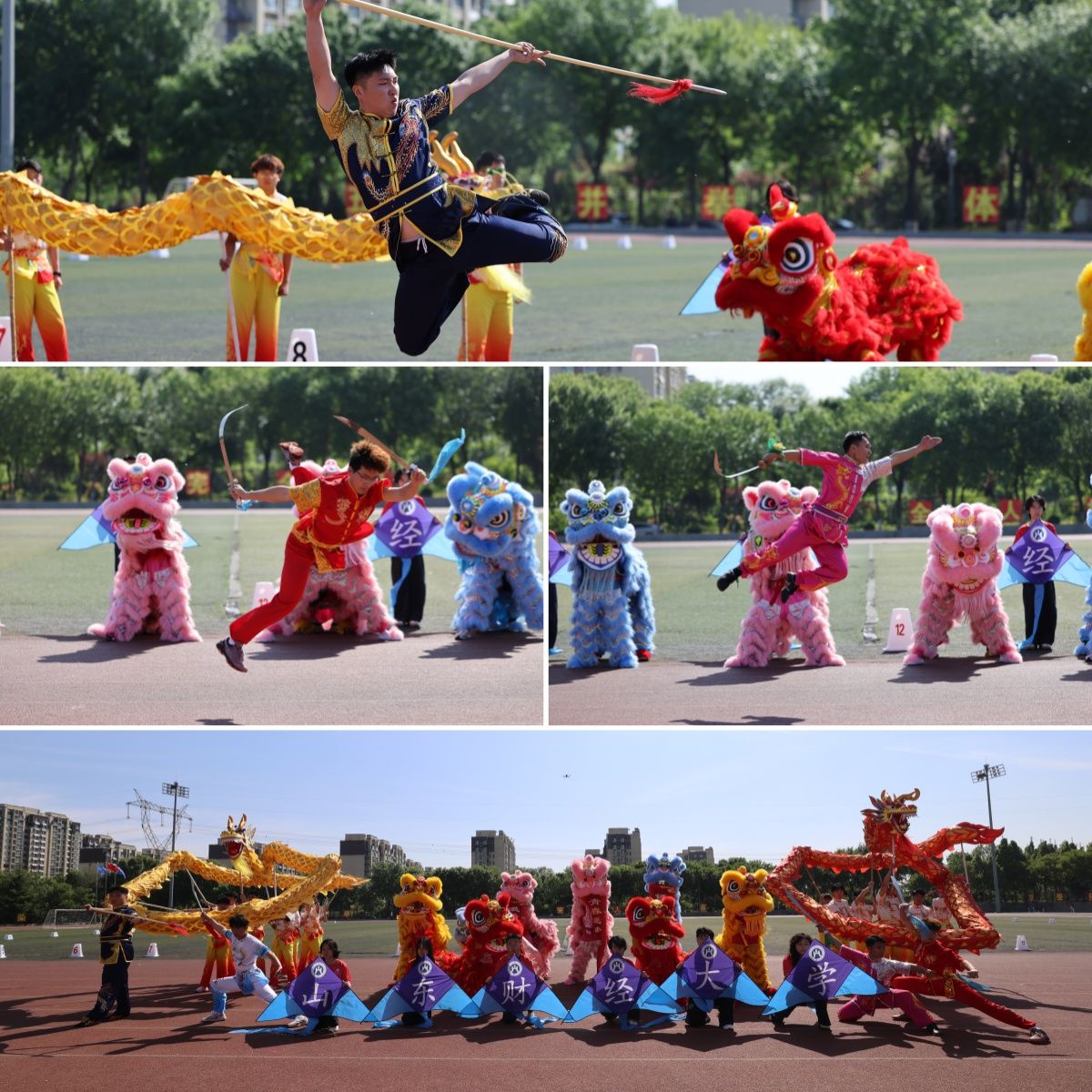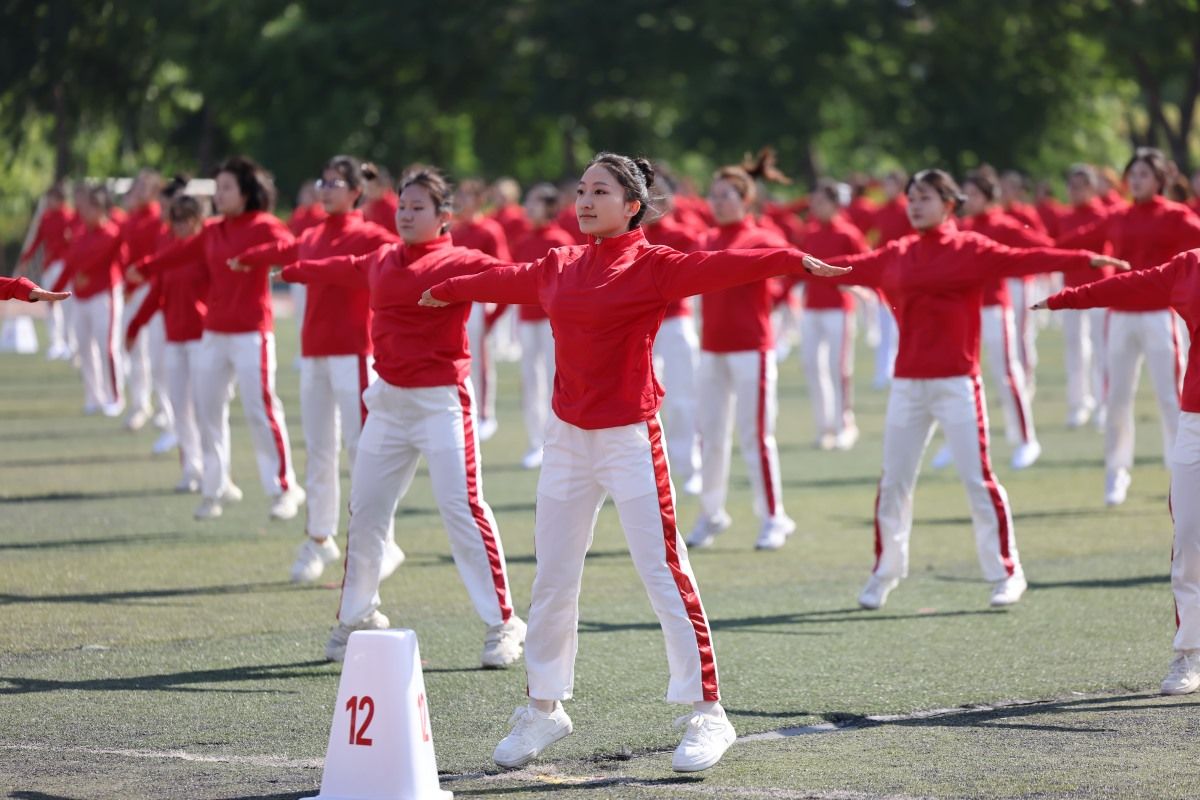开幕式上,一张张青春洋溢的面孔充满激情。在《第九套广播体操》表演中,460名2024级、2025级女生动作整齐划一,展现昂扬向上的青春气息。传统体育民俗表演融合武术、双刀、单刀、红缨枪、舞龙、舞狮等元素。源自南狮形象的红、黄、蓝、粉狮头,结合北派武术技艺,在鼓点中伏身回旋;高难度动作“三人转”舞狮首次亮相,醒狮灵动翻腾、动作环环相扣,赢得阵阵喝彩;两条舞龙时而穿跃、时而盘旋,一招一式间,尽显自强不息的风采。